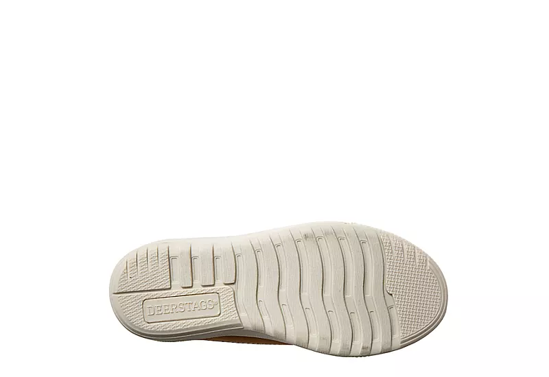 He can play or dress up in the Niles boys’ boot from Deer Stags. With a faux leather upper featuring a mesh lining for breathability, this hook & loop strap sneaker boot hybrid has no-tie bungee laces for easy entry. The insole cushions his foot while the athletic-styled sole flexibly support his movement.